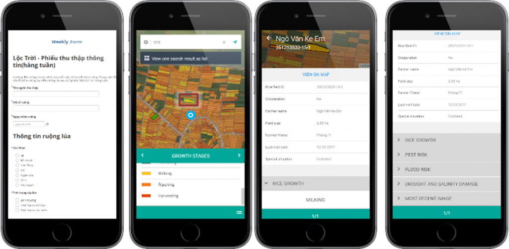 The Sat4Rice app allows data to be entered from the field, which integrated with satellite data in real-time. The resulting information in the database is then used both in the smartphone app for farmers, and in the professional desktop portal for agribusinesses.