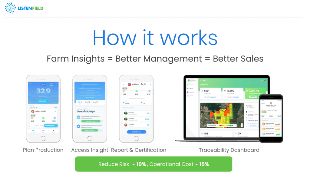 To date, FarmAI is being used by about 30,000 farmers in Thailand, directly and through their clients. ListenField was one of the finalists of the 2019 SEED Low Carbon Award, which is supported by UNDP and UNEP, and has partnerships with several organic farming communities and the Bank of Thailand.
