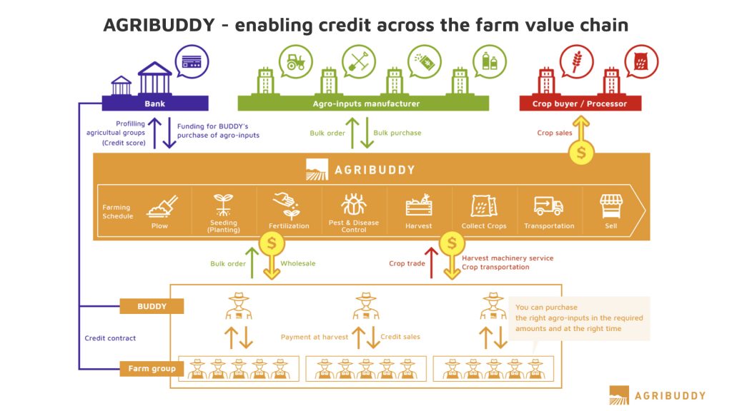 The goal is to connect the input suppliers to the digital platform using a cashless transaction system. Agribuddy’s large farmer network boosts their revenues, and in the future all aspects of the transactions will be on the blockchain which improves traceability.